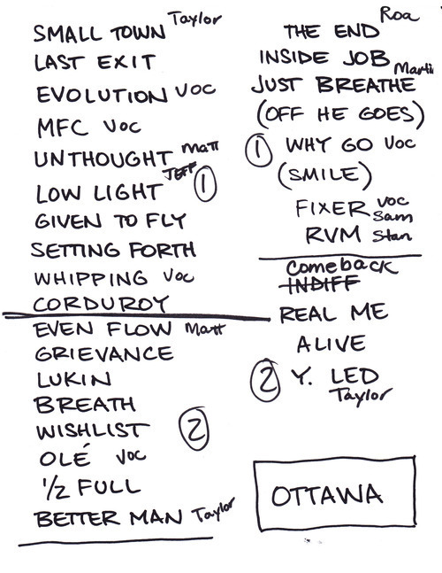 After a couple shows in Toronto, the boys traveled northeast to pay a visit to the nation’s capital. It was their first performance in Ottawa since 2005. Eddie made note of that during the opening song, Elderly Woman, by changing the lyrics to “my God it’s been six years…” before letting the crowd take over part of the chorus. After the sing-a-long start, they ramped up the energy with Last Exit and then went on to play four from Yield within the next five songs, with Unthought Known was thrown in as well. For the 4th show in a row, the band played Setting Forth off of Eddie’s Into the Wild solo record. A couple fast paced Vitalogy tracks and Even Flow followed. Eddie then points out two flags in the audience and directs the next song to one of them and pledges his Grievance. A typically quick Lukin leads into Breath, where Jeff’s bass work is very noticeable for good reasons. Ed talks about wildest dreams and gives a shout out to the Wishlist Foundation as it was the 5th anniversary of the organization, and thanks the founder. Wishlist is played and dedicated to the founder. An improvised tag is added to the end with these lyrics: